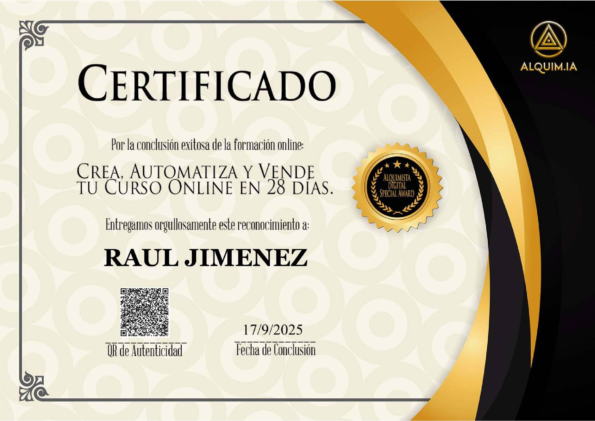 Cada día que pasa sin lanzar tu cursoEmpieza hoy, y una vez que termines esta formación 100% práctica, podrás lanzar tu negocio de productos digitales, automatizado y listo para recibir estudiantes de distintas partes del mundo.pierdes ventas.Además recibes (y aprenderás a emitir) un Certicado de conclusión con un QR de Autenticidad infalsificable.